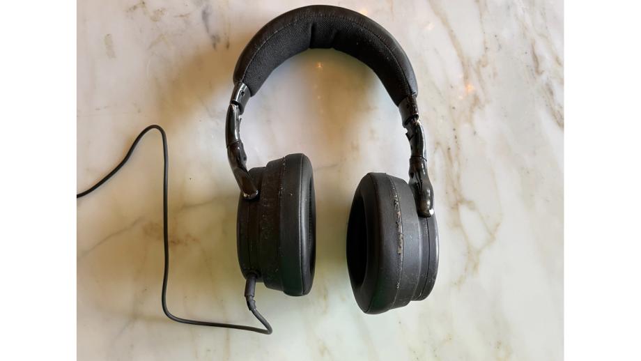 Maar die inspiratie begint dus met m’n koptelefoon. Kapotgebeten door onze hond. Maar hij doet het nog, dus hou ik ‘m op. WOOF WOOF!'