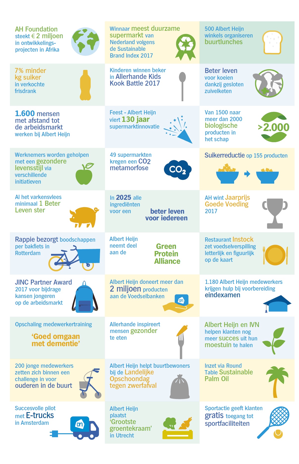Het verslag van Albert Heijn is geen vuistdik en gortdroog rapport waar niet doorheen te komen is. Gekozen is voor een kernachtige weergave in een infographic: (tekst loopt door onder beeld)