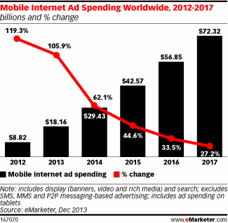 eMarketer verwacht dat de mobile advertising uitgaven in 2013 met 105,9% zijn gegroeid. Ook in 2014 verwachten zij een wereldwijde groei van 62,1%. In 2017 zal er zo'n 72,32 miljard dollar in mobile advertising om gaan. Dit is bijna 10x zoveel als 2012.