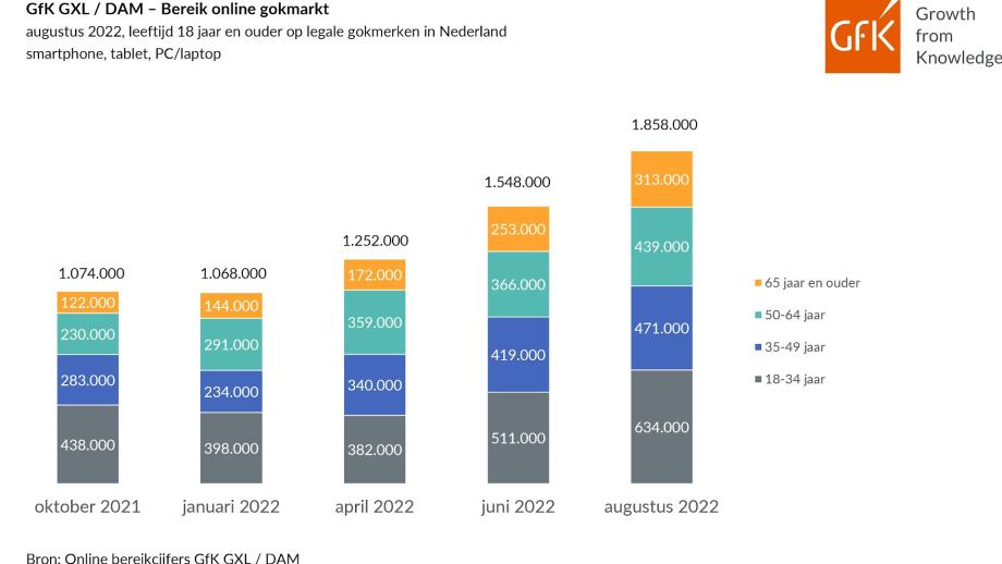De zestien aanbieders met een vergunning van de Kansspelautoriteit zijn Holland Casino, Toto, Kansino, Bet365, Fair Play Casino, GGpoker, Tombola, Bingoal, BetCity, LiveScore Bet, Jack’s Casino, Casino777, ZEbet, Circus, 711.nl en Unibet. Volgens GfK bereikten zij in augustus ruim 1,8 miljoen personen. De grootste groep is die van 18 tot 34 jaar. Ruim 634 duizend personen, oftewel zestien procent van de leeftijdsgroep, kwam in augustus in aanraking met één of meerdere legale gokwebsites of -apps. Van de 35-49-jarigen werd vijftien procent bereikt, van de 50-64-jarigen twaalf procent en van de 65-plussers zo'n tien procent.