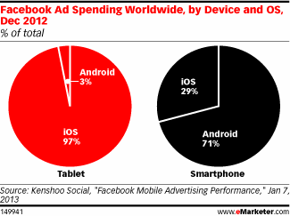 eMarketer heeft nieuwe cijfers gepubliceerd over advertentie uitgaves voor Facebook Mobile. Ruim 20% van de Facebook advertentie budgetten gaat reeds naar mobiel. Op tablet niveau wordt dit budget bijna voor 100% gebruik voor iPad. Bij smartphones gaat 71% richting Android. De CPC prijzen op mobiel liggen gemiddeld 70% hoger dan de desktop. Zie alle cijfes hieronder: