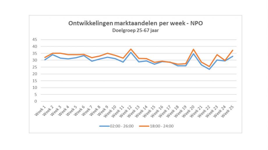 Daarnaast zien we sinds het WK Voetbal voor dames wordt uitgezonden het marktaandeel van NPO na een reeks matige weken weer een weg omhoog maken. De enige positieve uitzondering voor de NPO sinds week 13 was week 20, waarin Duncan Lawrence zijn Songfestivalsucces boekte.