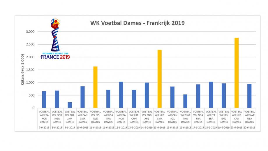 De pieken zien we uiteraard bij onze Oranje dames, ondanks het feit dat ze nu tweemaal ’s middags hebben gespeeld, waarvan eenmaal in het weekend. De wedstrijd van afgelopen donderdag – speeltijd 18.00 uur – leverde tot dusver de meeste kijkers op (ruim 2,7 miljoen).