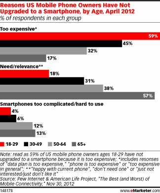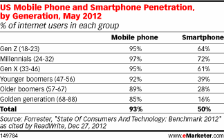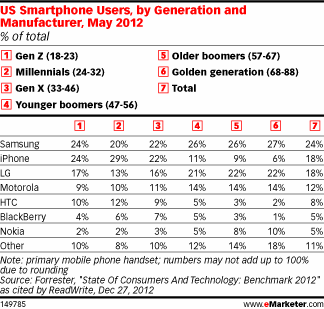 eMarketeer heeft nieuwe cijfers gepubliceerd over het smartphone bezit onder diverse doelgroepen. Generatie Y (24-32 jarigen) blijken hierin voorop te lopen. Voornaamste redenden dat mensen nog geen smartphone hadden waren: te duur, te complex of gebrek aan relevantie. Het onderzoek van eMarketeer is Amerikaans, dus helaas niet 1 op 1 over te nemen. Er zal vooral verschil zitten in het gebruik van toestelmerken. In Nederland is bijvoorbeeld het bezit van Motorolla en LG smartphones zeer beperkt.